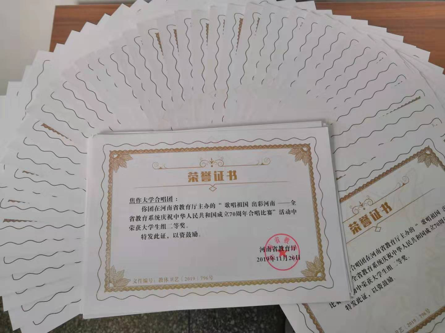 10月11日,河南省教育厅组织的高校系统庆祝中华人民共和国成立七十周年合唱比赛,在河南省广播电视大学进行,此次活动从今年3月开始,历时6个月,全省近100多所高校200多支合唱团报名参赛,最终专家组评审出80支合唱团,其中近70支为本科院校的合唱团,我校艺术学院合唱团最终通过评审进入决赛,并在决赛中荣获大学生组二等奖。