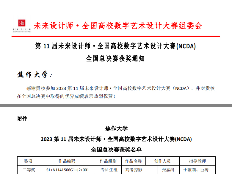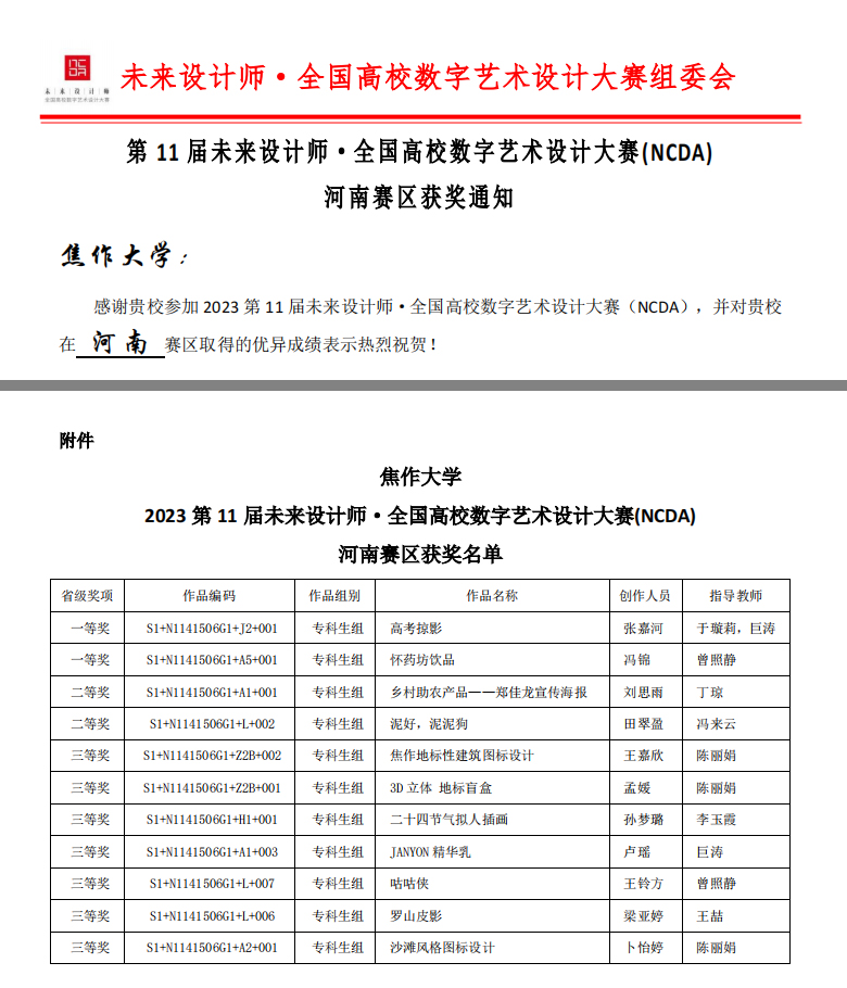 近日,第十一届未来设计师·全国高校数字艺术设计大赛圆满落幕。焦作大学艺术学院师生在河南赛区和全国总决赛中获得佳绩,荣获全国总决赛二等奖1项,省级赛一等奖2项、二等奖2项、三等奖7项。