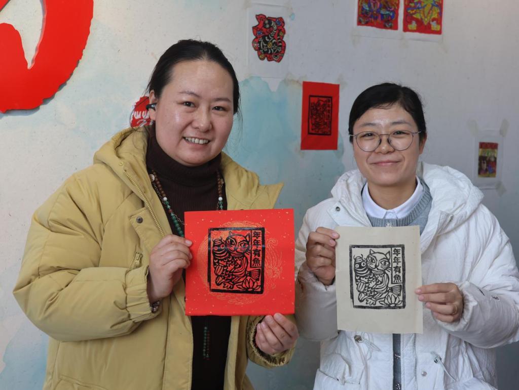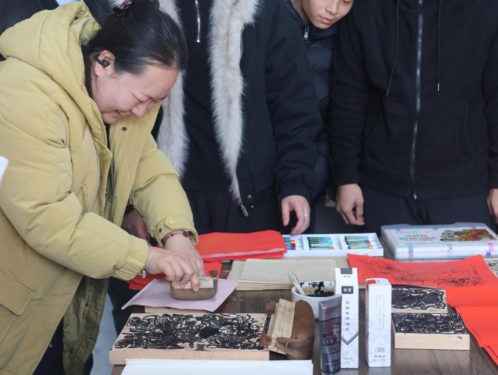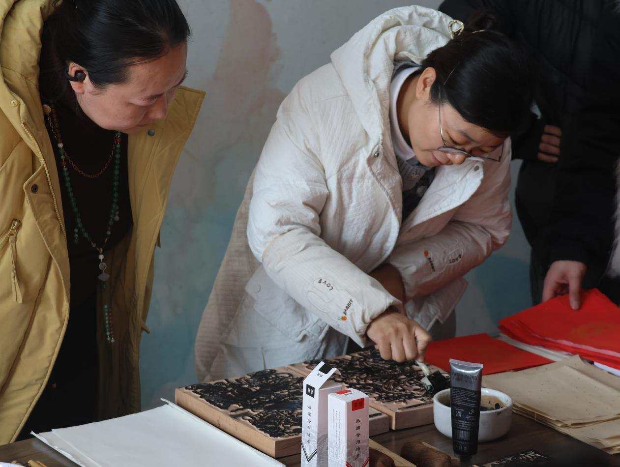 师生们纷纷动手创作。大家拿起毛刷,蘸上精心调好的颜料,在木板上轻点晕染,仿若唤醒了沉睡的年味。覆上宣纸,用掌心压实,再轻轻揭起,一幅饱含心血与祝福的木板年画惊艳呈现。这是与传统的亲密相拥,亦是献给新年的诚意之作。