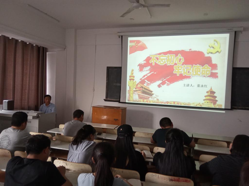 2019年9月23日年艺术系党总支书记在党员活动室开展“不忘初心 牢记使命”教育主题党课活动。不忘初心、牢记使命,是党保持永远年轻的重要法宝。党的十九大报告指出,“只有不忘初心、牢记使命、永远奋斗,才能让中国共产党永远年轻”。要让中国共产党永远年轻有活力,就要保持党的先进性、纯洁性、战斗性。开展“不忘初心、牢记使命”主题教育,就是进一步保持党的先进性,提高党的执政能力、巩固党的执政地位;就是进一步保持党的纯洁性,持续推动全面从严治党,严肃党内政治生活,净化党内政治生态;就是进一步保持党的战斗性,在决胜全面建成小康社会的战斗中、在推动经济社会全面发展的新使命中,勇往直前、奋发有为。
