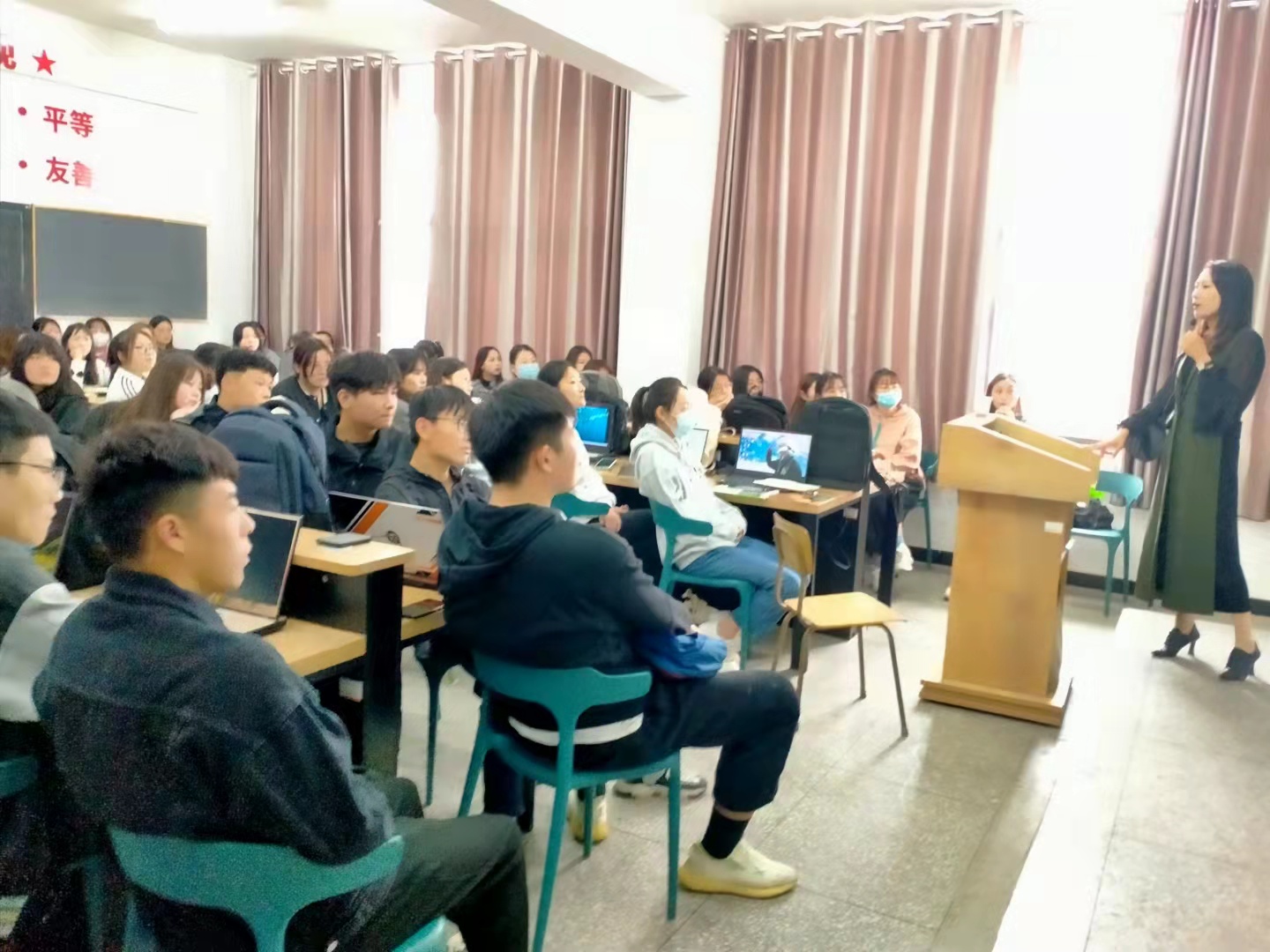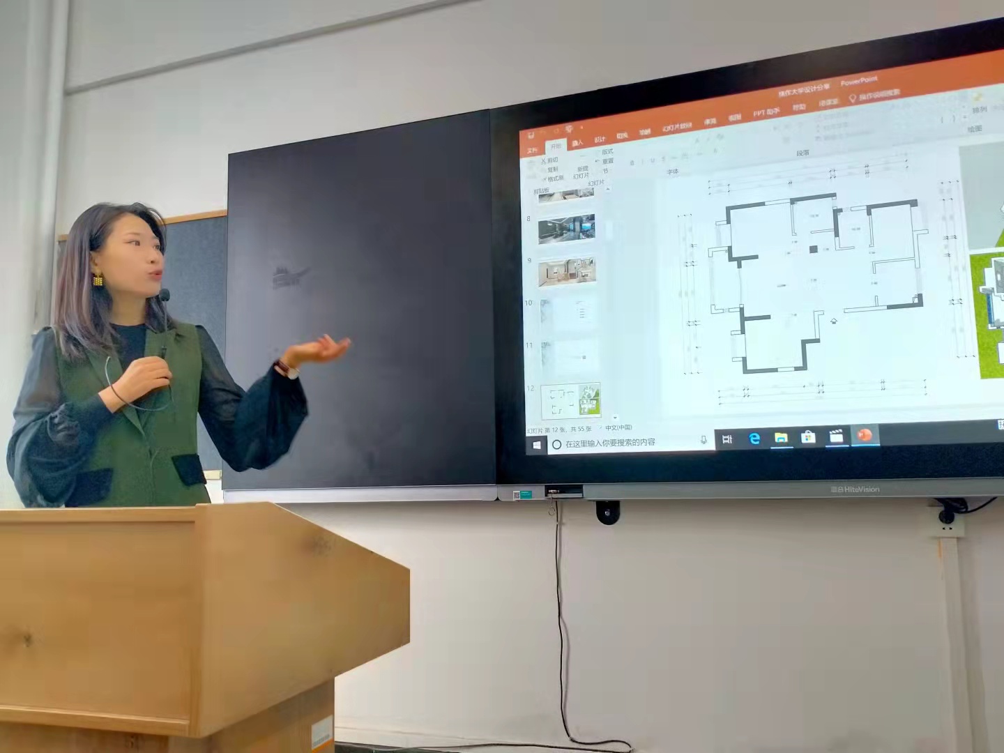 量完房,进入方案设计阶段,艺术学院特邀鸿基装饰签约设计师冯芳老师来为同学们做详细的案例设计分享,带领大家以设计师的视角分析一套方案的完成过程。冯芳老师毕业于河南理工大学,中国国家级建造师、国家级二级照明设计师、中国建筑室内设计分会CIID会员、新设荟软装学院高级注册设计师,从事专业室内设计11年。冯老师带来一套135m2的设计项目,对其进行完整的过程分析,综合了“居住空间设计”需要的理论知识、专业技能和职业素养。通过户型分析、方案解析、空间解析、设计规划的讲解,给同学们提供了一些可操作性的设计起始流程和思考点。其间,业主情况分析以及相应的户型改造设计引发了同学们极大的兴趣;住宅设计系统的部分,从生活习性、储物系统、设备系统、电路系统、灯光环境几方面的专业度使同学们认识到家装设计智能化的发展趋势,未来学习的路还很长,只有不断的学习进步,才能在设计行业走的更稳更远;门厅、客厅、厨房、卧室等各个功能分区的设计细节,使同学们深刻领悟了什么是“以人为本”的设计;最后详解了居住空间室内设计的具体任务和工作流程,展示了整套施工图纸,使同学们了解了未来的工作内容,对现阶段的学习树立了清晰的目标。