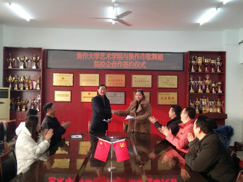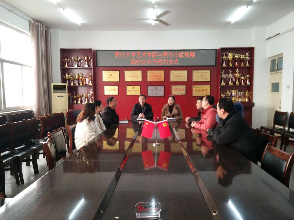 2020年1月3日上午,焦作大学艺术学院与焦作市歌舞剧院校企合作签约仪式在北校区主教5楼会议室顺利举行。焦作市歌舞剧院董事长郑钰荟女士、艺术学院院长范涛同志、党总支书记董永红同志、党总支副书记乔磊同志及教师代表出席签约仪式。