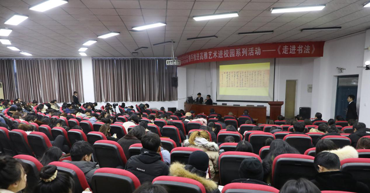 为传承中华文化、品中华经典、赏文化韵律,提高大学生对中华经典文化韵律的感受力和传承素养。艺术学院公共艺术教学部与金海文化艺术公司于20191226日上午在北校区报告厅,召开高雅艺术进校园系列活动——《走进书法》讲座。