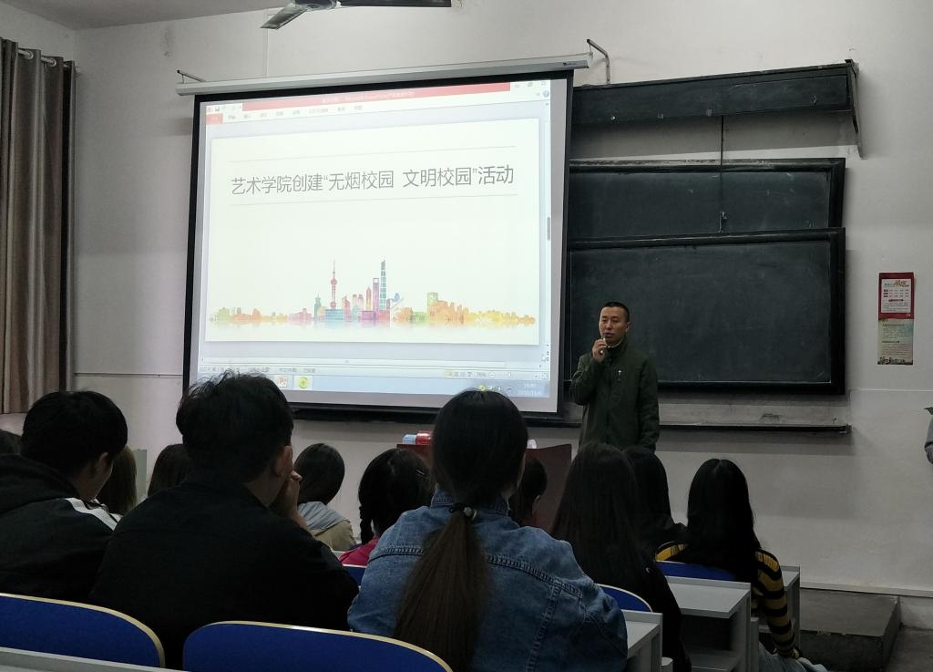 2019年11月4日,艺术学院在北校区召开“创建无烟校园,文明校园活动”动员会。文明校园需要每个人参与,互相尊重,互相关爱是大学校园亮丽风景,文明礼貌,利人利己是大学生亮丽的风采。希望通过动员大家参与到创建活动中来,从禁止公共场所吸烟开始,从自我做起,做文明使者,做文明大学生。