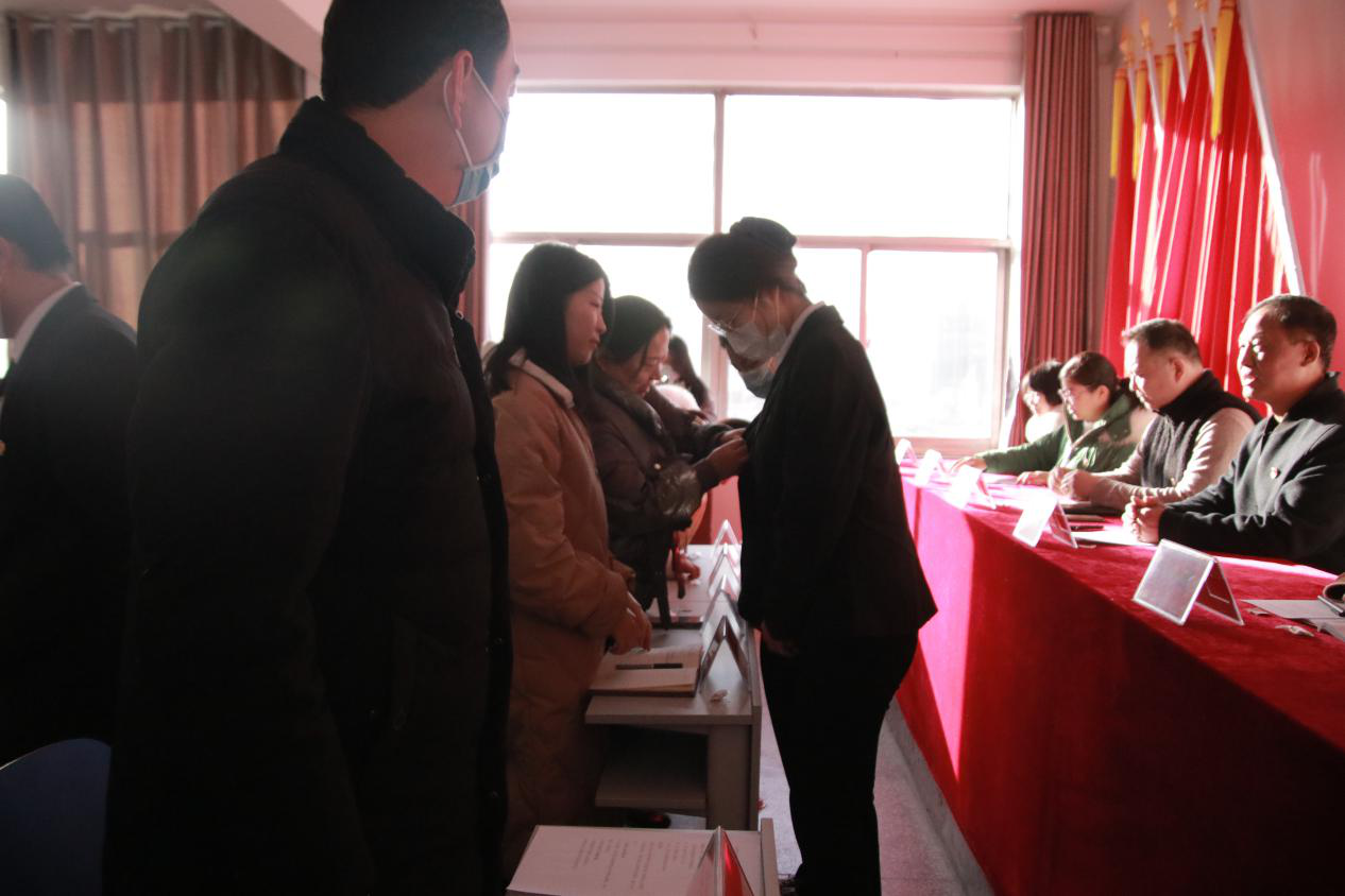 宣誓在《国际歌》中拉开序幕,大会首先由党总支副书记、学生支部书记乔磊同志宣读了校党委接收新党员决议,随后由乔磊同志带领新老党员进行宣誓,大家举起右拳,庄严宣誓,群情激昂。老党员为新党员们佩戴上党徽。来自19级视传2班的张力文同学代表新党员发言,表达了自己要恪守在党旗下的诺言,努力使自己成为一名优秀共产党员的决心和信心。