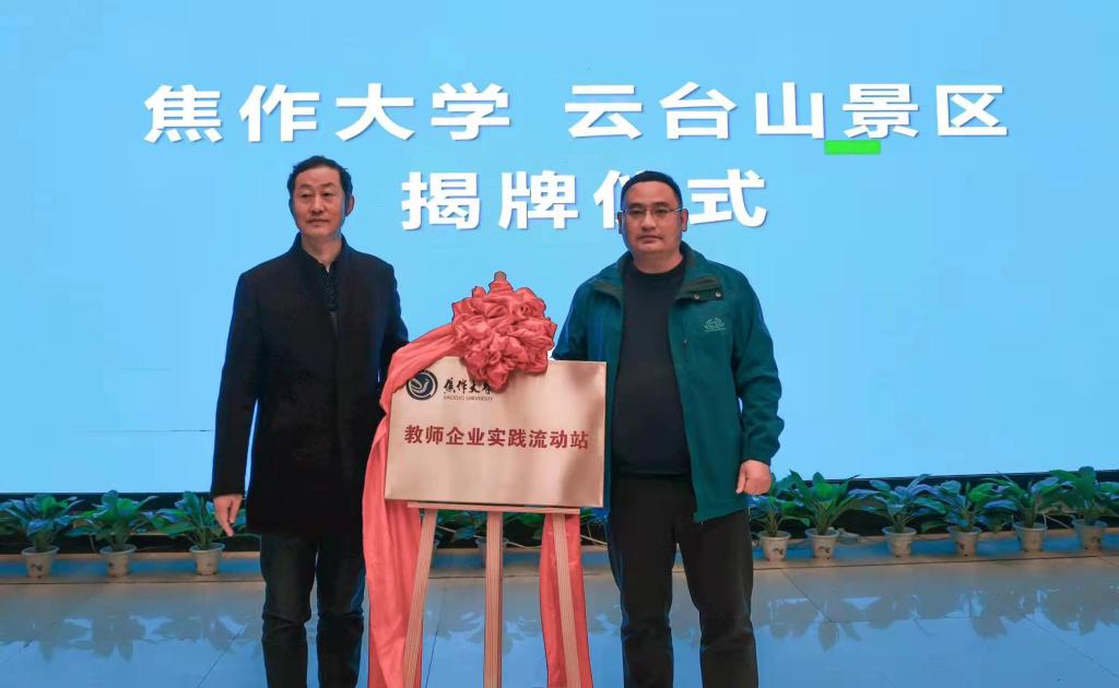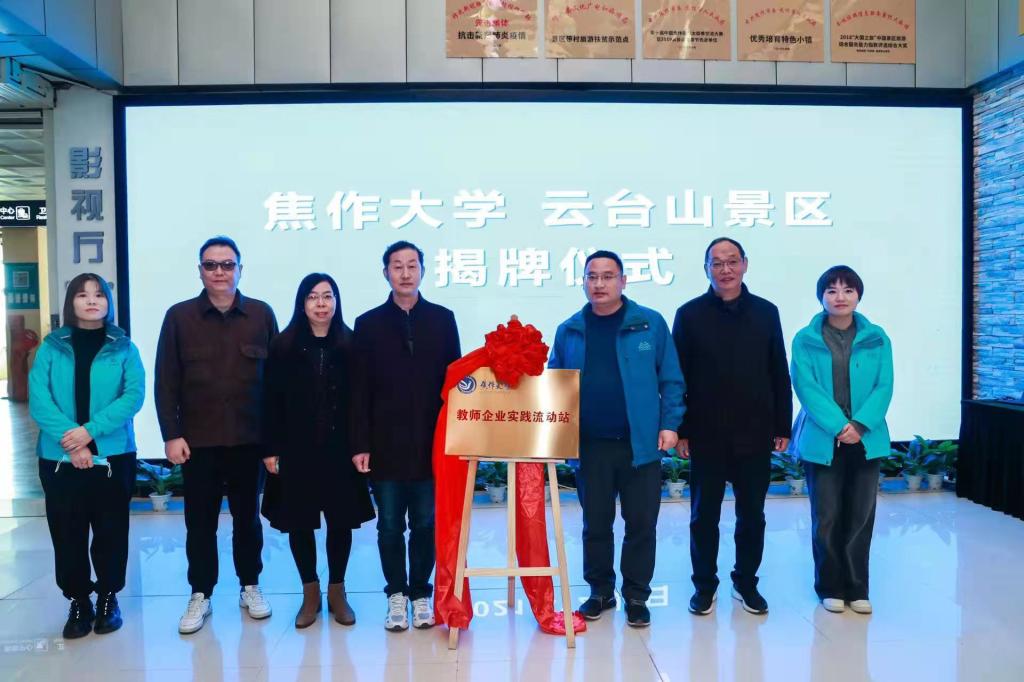 11月25日,我校对外合作处处长赵春青、艺术学院院长范涛、经济管理学院院长张建国、艺术学院党总支副书记乔磊一行4人前往云台山风景旅游管理局与云台山风景旅游管理局常务副局长李伟力、营销总监吴沛萌等企业领导举行了“焦作大学教师企业实践流动站”挂牌仪式。