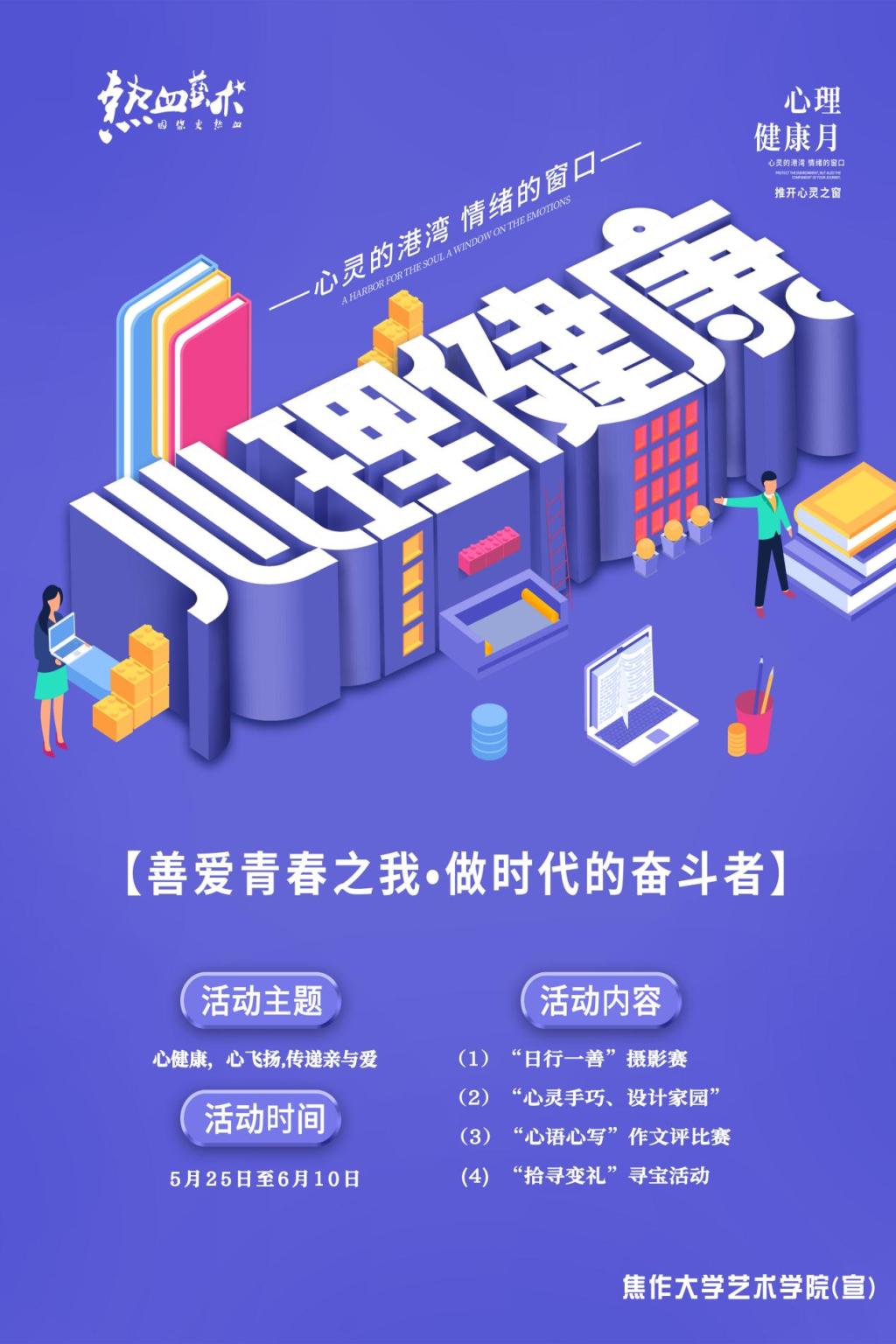 为进一步强化大学生的心理健康教育,推进心理健康教育工作的开展,营造积极向上、健康和谐的校园文化氛围,使大学生科学的认识健康心理指标、了解心理健康知识,掌握必要的心理调试方法,形成正确的心理健康观念,以积极向上的阳光心态面对大学生活,学院充分利用班级会议、日常查宿舍、社团活动等方式,5月25日焦作大学艺术学院开展了“心健康,心飞扬,传递亲与爱”为主题的健康心理教育系列活动。引导广大师生树立正确的价值观、人生观、培育良好的大学生风范。