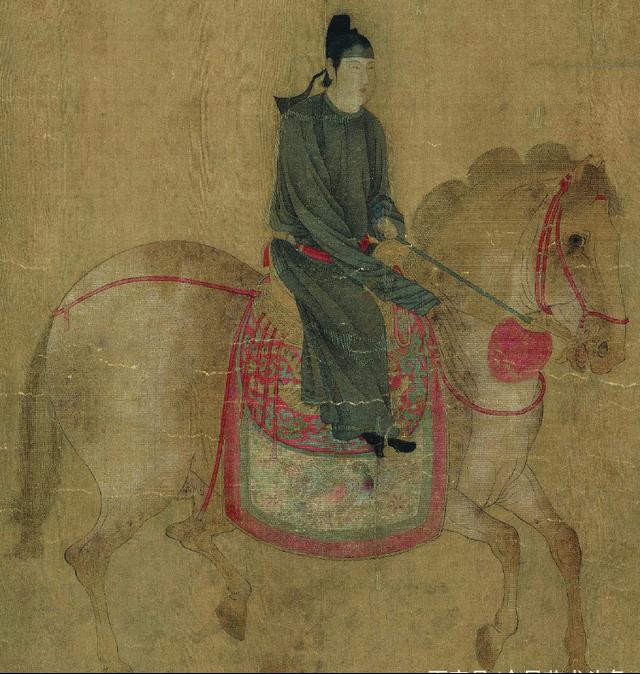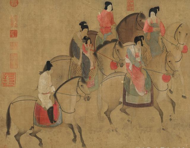 《虢国夫人游春图》是中国唐代著名画家张萱的一幅传世珍品。此画卷描绘了唐玄宗宠妃杨玉环的三姐虢国夫人在众女仆的导引和护卫下乘骑踏青游春,真实地描绘了唐代上层社会妇女闲散享乐的生活,展现了贵族妇女的骄纵和欢畅?;碇泻稳宋焦蛉耍谒挡灰?,一种说法认为右起第五人应是虢国夫人。唐朝时期由于受游牧民族的深远影响,马在人们生活中的地位无比重要,也是人们身份和地位的重要标志,地位较低的平民、商人、进士等不得骑马只能骑驴。而虢国夫人所骑的马可是有名的“三花马”,把马鬃修剪成三个弧形,这是御马独有的标志,图中两匹“三花马”,后一匹为虢国女儿及侍姆所骑,而虢国的三花马更加威武雄壮,形体最硕大健壮,品种最名贵,装饰最豪华,刺绣、金饰最精美。北宋美术评论家郭若虚也曾指出:“张萱画虢国夫人出行图中有‘三花马’”。而且古代的骑乘是有尊卑贵贱之分的,一是马胸前的“踢胸”即红缨饰物,这是一种表明身份的警示标志,遇见这样标志的人必须让道、回避或下马;二是马肚两旁的“障泥”,因为骑者身份高贵,衣服不能有丝毫污泥,所以主人的“障泥”都比较长,而仆人的“障泥”不能超过马肚。