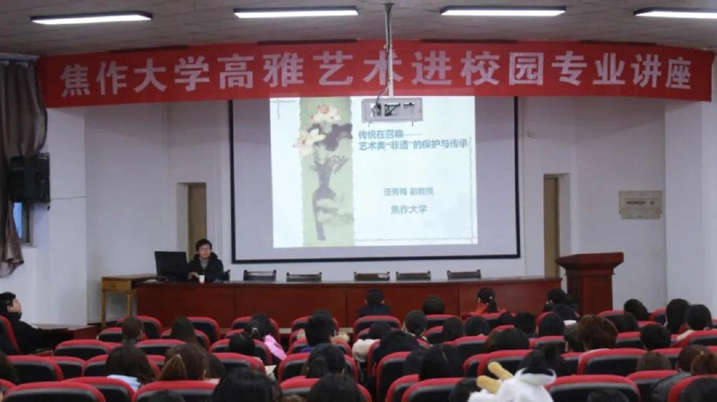 为进一步推进高雅艺术进校园活动,丰富校园文化生活,提高师生艺术修养,焦作大学艺术学院于2020年12月25日下午14:30在北校区现教中心报告厅,举办高雅艺术进校园系列专题讲座。本次讲座由音乐表演教研室主任任秀梅副教授主讲,内容为艺术类“非物质文化遗产”的保护与传承。莅临讲座的领导及教师有:王喆副院长,王帆老师、张慧老师、王丽丽老师、邱敬华老师、郭静老师和孙娟老师等。