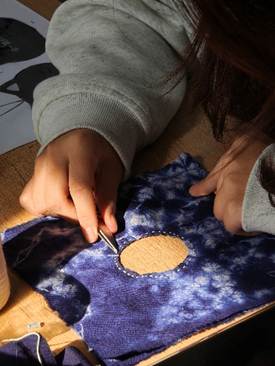 带领学生学习“折、扎、缝、染”等核心技艺,掌握捆扎松紧、染料调配等关键技巧。